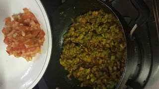- After 2-3 minutes add chopped tomatoes we will cook it till the Tomatoes sweat now add soaked (1/2 hr) 1 cup of Moong Dal.